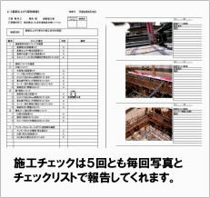 家の基礎を2008年5月にはじめて、8月20日の完成まで5回ほど「施工チェック」がありました。一級建築士の資格を持っている専門検査員の方が毎回、写真つきの報告書を提出してくれたので安心でした。